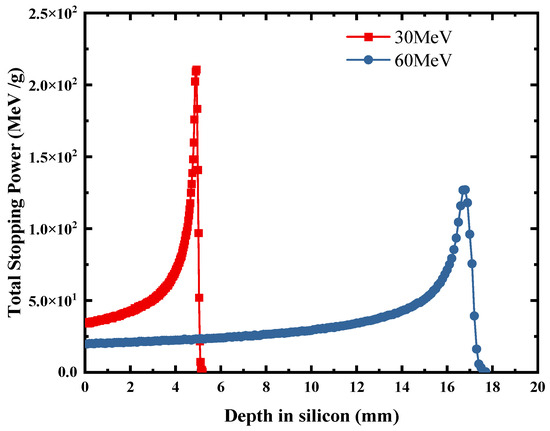 Depth dose of 30 MeV and 60 MeV protons in silicon.