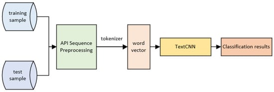 After API sequence matching for the API call sequences to be tested, those sequences marked as 0 are further detected using the TextCNN model. The detection process of malicious programs in the neural network model is shown in Figure 3.