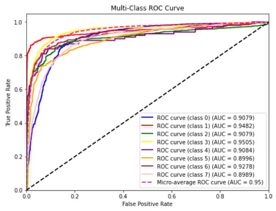 The AUC value represents the area under the ROC curve. It serves as an evaluation metric to assess the quality of a classification model and effectively describes the model’s overall performance. The ROC curves for each class of the TextCNN model with convolutional kernel sizes of 1, 3, and 5 are illustrated in Figure 7.