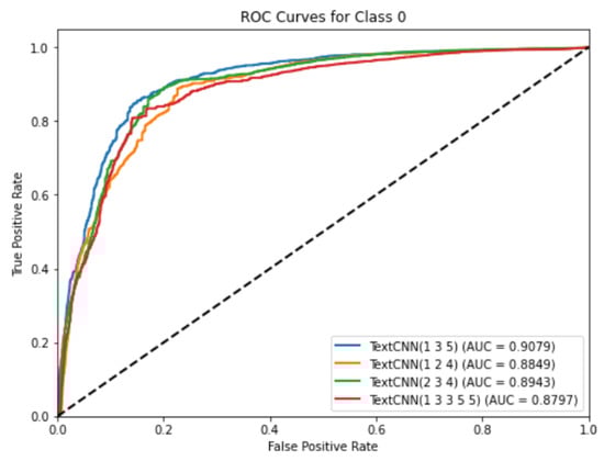Figure 8 shows the ROC curves of the four TextCNN models, from which it can be seen that the TextCNN model with convolutional kernel sizes 1, 3, and 5 exhibits the largest AUC value, indicating superior performance compared to the other models.