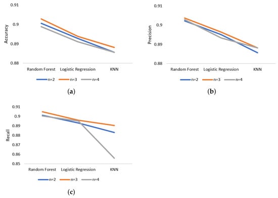 Furthermore, to validate the efficacy of deep learning, a machine learning algorithm is employed. The N-Gram algorithm is utilized for feature extraction of API call sequences, and the optimal size of n in the N-Gram algorithm must be determined to achieve the best classification performance. The value of n is set to 2, 3, and 4, and the random forest algorithm (the number of decision trees is set to 500), logistic regression and KNN algorithm are selected for model training.