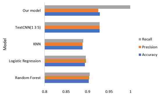 According to Figure 9 and Table 6, it can be seen that for the same value of n, the random forest algorithm outperforms logistic regression and KNN in terms of accuracy, precision and recall, and when n is taken as 3, the random forest algorithm achieves the highest performance in terms of Accuracy, Precision and Recall. All three algorithms exhibit slightly better detection results when , compared to when or 4. However, their performance is still inferior to that of deep learning. The comparison chart of the detection results of machine learning algorithms and TextCNN and our model is shown in Figure 10.