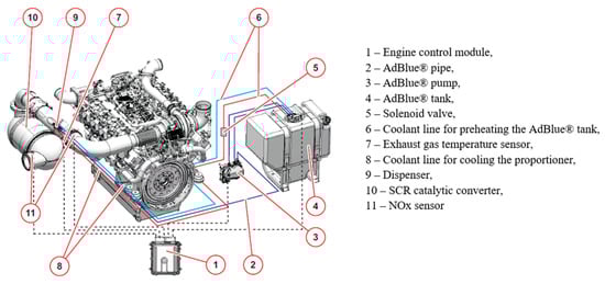 The measurement data that formed the basis for the study were obtained from the SYNAPSA system. This system plays a key role in collecting and analyzing data related to the operation of various mining vehicles. In this case, the data were obtained from a specific LHD vehicle (see Figure 2), which was equipped with a turbocharged diesel engine DEUTZ TCD 12.0 V6 and a selective catalytic reduction (SCR) system, as shown in Figure 3.