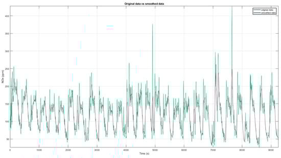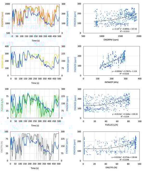 The collected data are sequential; however, depending on the operator and workload of the vehicle, some short-term outliers can be observed. To obtain the best results from collected data, those short peaks were smoothed with the moving average method for better visibility of dependencies. When the load is higher, more power is needed, so fuel consumption increases which results in higher NOx emissions.
