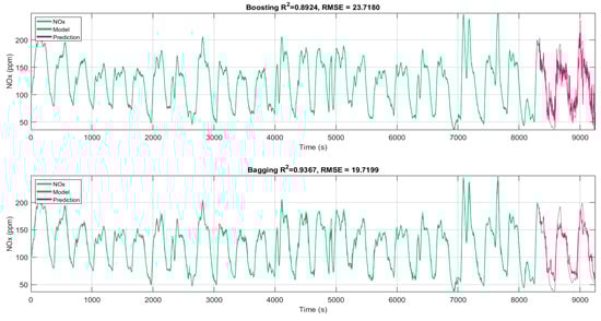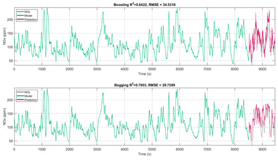 The final results provide satisfying NOx prediction, shown below in Figure 13 and Figure 14. Although the data were not such explicitly periodical as in the first working shift (the second operator had a more dynamic manner of driving), for the same learning parameters, the model still gave a good result. For bagging, the R2 value was about 0.79 and the lower RMSE (root mean square error) was under 29 ppm, which is comparable with the accuracy for transient regimes of physical NOx sensors available on the market.