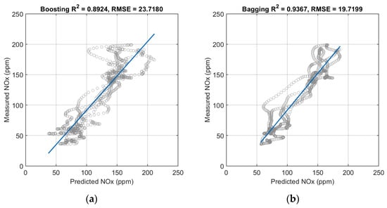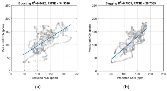 Relationships between measured and predicted values of NOx (ppm) by two methods: (a) boosting (linear trend (blue line) y = 1.13x − 21.60); and (b) bagging (linear trend (blue line) y = 1.21x − 29.59) for the first dataset.