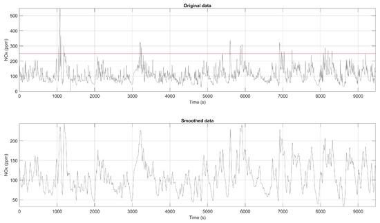 To check the robustness of the developed model, the different working shift time period was taken for testing at the next stage of the NOx prediction model verification. Results of the calculation showed that both methods also had satisfactory results for the data collected during the work of another operator on the same LHD vehicle. The original data (see Figure 11) were not as repetitive as the data from the first operator dataset (Figure 6). Time series also required smoothing as in the first case and spikes were truncated. The truncation level (250 ppm) is presented by a line in the below figure. It was assigned based on data analysis and iterative testing of the prediction model to satisfy the requirement of minimal manual intrusion into a dataset and maximum model accuracy. In the future, this level may be changed after historical data processing for many operators and LHD vehicles.
