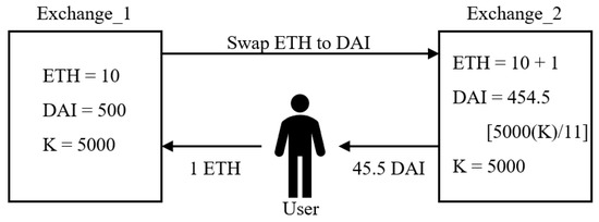 CPMM is an algorithm in which the product of X and Y, which changes after performing all transactions within liquidity, is always maintained at a constant K. When exchanging X for Y in Token Fairpool, the amount of X decreases, and the amount of Y increases. Accordingly, the price of x falls, the price of y rises, and K remains constant. Figure 1 shows an example of a CPMM-based transaction. The user perceived the price of DAI compared to ETH before the transaction as 1:50, but temporary price fluctuations (slippage) [15] that caused a significant difference occurred due to CPMM. This slippage occurs as the amount of liquidity provided to the exchange increases (the larger K), and lower is the amount of price fluctuation that occurs when executing a transaction. Therefore, exchanges provide transaction fees to liquidity providers to increase liquidity.