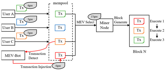 DeFi and DEX are receiving a lot of attention amid new technological innovations in blockchain, but at the same time, they are facing various security threats. Various attack techniques such as smart contract vulnerabilities, market manipulation, and front-running are emerging as major threats in this field [3,4]. The emergence of MEV (Maximal Extractable Value) bots, one of the major threats, is gaining profits through vulnerabilities in decentralized finance and causing losses in commissions and exchange fees for users’ transaction execution. Various attempts by MEV to target the security vulnerabilities of the blockchain itself or the vulnerabilities of the DEX have been discovered, damaging transaction integrity and fairness. Security issues and attacks on decentralized financial services expose users’ assets to direct risk undermine the reliability of blockchain platforms and services and affect the stability of the entire market [5]. For a fair and trustworthy financial environment, thorough analysis and understanding of the security vulnerabilities and attack methods of distributed finance are essential. This analysis will provide an important foundation for the sustainable growth and development of DeFi and DEX.