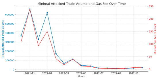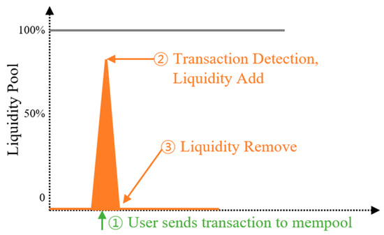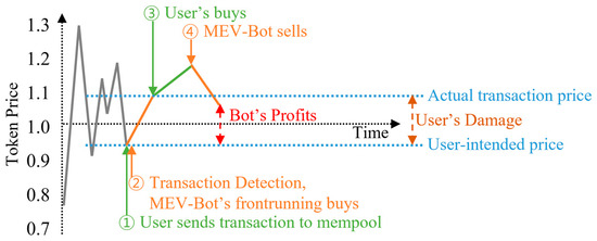 According to Equations (2) and (3), the lower the quantity of tokens in the liquidity pool, x, the higher the profits. However, if interpreted more intuitively, the increase in profits is confirmed to be proportional to the quantity of tokens purchased by attackers and users. Unlike arbitrage bots, sandwich attacks cannot occur in a single transaction. However, through relay services such as Universal Router [19] and Flashbot [20], multiple attack transactions allow the buy-sell attack logic to be closely performed. A typical sandwich attack is performed with the logic of detecting a user’s purchase and purchasing it in advance, but in extremely rare cases, an attack is discovered in which the attacker sells and then repurchases the assets he or she holds. In this case, it is recorded as a very rare case in that the attacker must have in advance held a cryptocurrency asset with price volatility. In the case of a sandwich attack, a back-running attack is performed together with a front-running attack. Contrary to front-running, back-running attacks are aimed at processing the victim’s transactions immediately after or further after they are confirmed in the mempool. To achieve this, MEV-bot creates transactions with a fee that is approximately equal to or slightly lower than the fee of the target transaction. When an attacker detects a transaction with a large transaction size, he or she submits a counter order to take advantage of the high slippage that temporarily occurs upon the execution of the transaction.