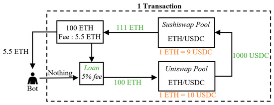 MEV-bot’s activities that occur on DEX include an arbitrage strategy that utilizes price differences between various distributed exchanges. Price differences between decentralized exchanges mainly occur when assets have low liquidity or when market information is updated slowly. Arbitrage bots monitor prices on multiple exchanges in real time and achieve profits by purchasing assets at a low price on one exchange and selling them at a high price on another exchange. This process can be considered to contribute to increasing market efficiency and balancing prices between exchanges. However, it can be defined as a type of attack that ultimately causes damage to users and liquidity providers and generates profits. Arbitrage bots can perform arbitrage through their own assets, but more cases of attacks are being discovered through flash loan [22], which was introduced in Uniswap V2. Figure 5 shows the process of conducting arbitrage through flash loans.