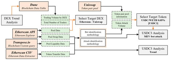 We use Dune [23] data table, Etherscan explorer API [24], Transpose custom query API [25], and Etherscan CSV export tool [26] to collect data about decentralized exchanges on the Ethereum blockchain network. Data collection was conducted from January 2022 to December 2023, ranging from a minimum of block number 13,916,330 to a maximum of block number 18,901,697. Figure 6 shows the data collection and analysis steps for the analysis process of this paper.