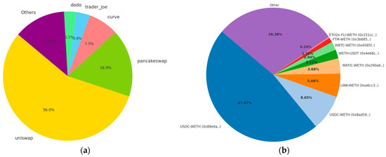 (a) Pie chart according to transaction share of decentralized exchanges; (b) number of attacks on Uniswap’s token pairs.