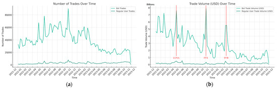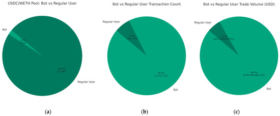 MEV-bot attacks are carried out by detecting large-scale transactions by users, and the reason why the bot’s transaction volume has increased significantly is because the transactions of general users have also increased proportionately. To interpret the reason why general users’ transactions increased on the date indicated by the red dotted line in Figure 10a, it can be predicted as follows: