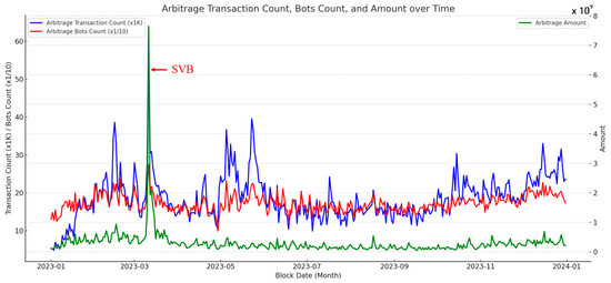 Through the collected data, we measured the transactions of USDC3 pool bots and regular users over time. Figure 10 shows the number of transactions and volume over time for the two groups in the USDC3 pool. As can be seen in Figure 10b, the volume of MEV-bot attacks rises significantly in situations of large-scale adverse events such as the Terra/Luna plunge, FTX bankruptcy, and Silicon Valley Bank bankruptcy.