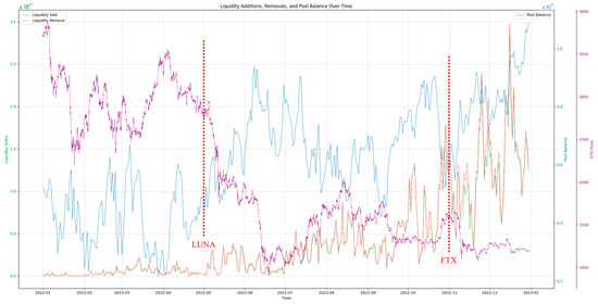 Figure 13 is a graph of the liquidity events and pool balance of the Uniswap USDC/WETH token pair pool, and the spot price of Ethereum coins. Figure 13 shows the Luna crash and FTX bankruptcy events. This event is bad news for the blockchain, and as a result, the price of Ethereum spot assets fell. However, as the price of Ethereum falls and the subsequent fee price falls, decentralized finance shows an upward trend in the graph. This trend may be due to the decline in the price of ETH and the large amount of token swaps that occurred due to the stable characteristics of USDC. Large-scale transactions where WETH is swapped for USDC are increasing, and this increase in DEX trading volume increases the number of liquidity providers targeting fees for providing liquidity. Accordingly, in Figure 13, the pool balance and swap amount increased significantly.