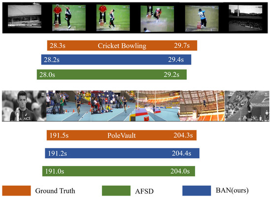 In this section, we compare the visualization results of our method and the state-of-the-art method AFSD [12] on the THUMOS14 test set and the results are shown in Figure 3. Our proposed method has a greater ability to find action boundaries, according to the results.