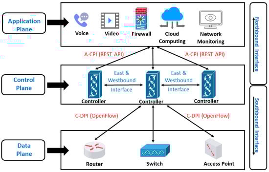 Increased network scalability and flexibility are advantages of SDN. Network administrators may simply manage, configure, and enhance the network with a centralized controller. SDN additionally enables the development of virtual networks that can be altered to accommodate particular applications or traffic types. The SDN architecture is depicted in Figure 1, and is made up of the data plane, control plane, and application plane [7,8].