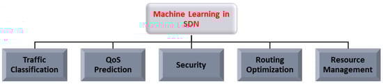 Network managers may therefore create networks that are more flexible, efficient, and safe by integrating SDN and ML. According to Figure 2, In SDN, a variety of tasks can benefit from the utilization of ML algorithms, such as network resource management, where they can forecast traffic demand and dynamically assign network resources to satisfy it. This may result in greater network resource use, which would lower overall operation costs [26].