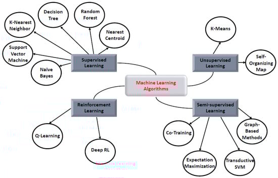 RL represents a form of ML training that relies on rewarding favorable behaviors and/or penalizing unfavorable ones. In general, an RL agent possesses the ability to perceive and interpret its environment, take actions, and acquire knowledge through the process of trial and error [101,102]. In the context of SDN implementation, RL is employed, with the controller assuming the role of the agent, while the network serves as the environment. The controller observes the state of the network and learns to make decisions regarding data forwarding. Figure 5 provides an overview of the ML algorithms.