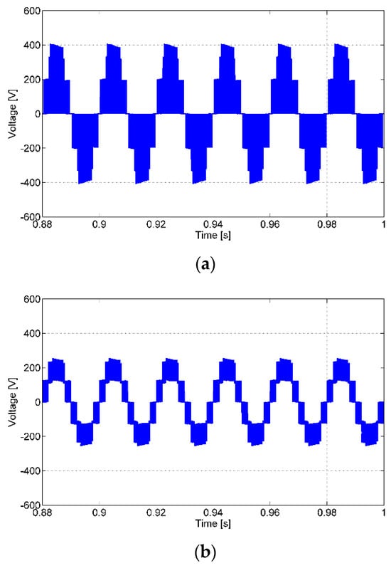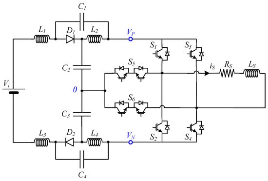 Due to the limitations of two-level VSIs, several boost-capable inverters have been proposed. Inverters based on impedance-source networks have been successfully proposed. The impedance-source inverter topology, which was originally defined by a two-port network consisting of four energy storage components feeding a bridge inverter, overcomes some problems of the two-level VSIs by exhibiting buck–boost characteristics [,,,]. Energy storage components connected to suitably driven VSIs can provide buck–boost voltages while also addressing the shoot-through issue. Shoot through is a topological restriction in VSIs, but in impedance-source inverters, it is used to obtain the boost voltage characteristics. This capability of using the shoot-through state provides an additional advantage in terms of reliability. Indeed, unlike in two-level VSIs, a noise-induced short-circuit between the VSI DC terminals does not damage the power semiconductors. This allows for the elimination of dead times, thereby improving waveform quality. Another advantage of using impedance-source networks is their integration compatibility with standard multilevel inverters. Due to these important features, new configurations of impedance-source networks have been proposed and developed [], including networks based on active structures and transformer-based networks [,,]. Among the several impedance source networks that have been proposed, the quasi-impedance-source (quasi-Z) inverter is one of the most widely used [,]. Because of their interesting capabilities, these converters can be used in a variety of applications, including photovoltaic generation and energy storage systems [,,,,]. Other applications require a fault-tolerance capability since power device short-circuits do not cause immediate damage to the converter. On the other hand, due to their buck–boost, wide-ranging voltage, they allow, up to a certain extent, the reconfiguration of the circuit to maintain their operation without affecting the voltage and current waveforms severely [,,]. Furthermore, these converters enable the use of PWM modulators which have been modified to account for the generation of the shoot-through time interval. This is true, for example, for Simple Boost Control (SBC), Maximum Boost Control (MBC), and Maximum Constant Boost Control (MCBC) [].
