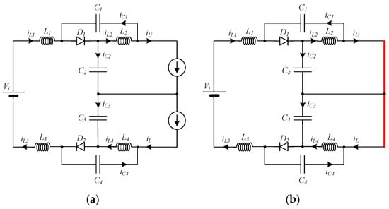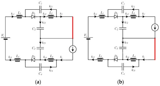 Equivalent circuits associated with the two extra shoot-through states: (a) upper shoot-through state, (b) lower shoot-through state. Shoot-through states (or short-circuit states) are represented in red color.