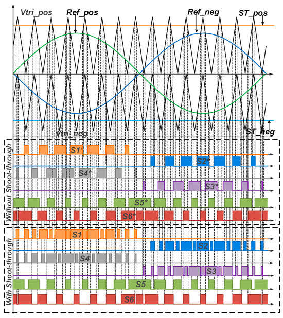 Implementation of the proposed PWM modulation strategy. The S1*–S6* are the transistor gate signals without shoot-through and the S1–S6 are the transistor gate signals considering the shoot-through.