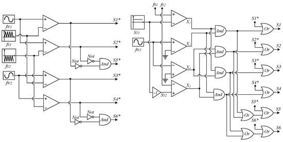 The states analysis presented in Table 1 allows for the development of the new PWM modulation strategy that takes into account the upper and lower shoot-through states in order to avoid decreasing more than one voltage level when the shoot-through is activated. Figure 6 shows the developed PWM modulation strategy along with the corresponding switching scheme. Figure 7 depicts the implementation of this strategy. This demonstrates that the implementation of this strategy is simple, as illustrated using digital circuitry. Another aspect to note in the comparison of the two strategies (Figure 4 and Figure 6) is that the number of switches that change state during transitions is lower. This is a positive characteristic as it improves the converter’s efficiency.