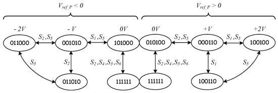 Additionally, the redundant states are used to reduce the number of switches that change state during transitions without affecting the output voltage distortion, while decreasing the switching losses. The idea is not to change the desired voltage level, but only to minimize the number of devices switching, maintaining in this way the THD of the output voltage and current. Based on the combinatorial analysis presented in Table 1, the machine state sequence obtained to reduce the number of switching devices is shown in Figure 8. In this diagram, the ellipses represent the state of the switches at that voltage level, while the arrows represent the switches that change state to reach a specific voltage level.