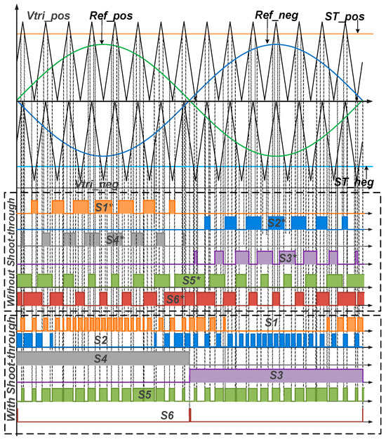 Modulators, carrier signals, and switch gate signals for the proposed SPWM modulation strategy with minimization of the number of switches that change during the transitions. The S1*–S6* are the transistor gate signals without shoot-through and the S1–S6 are the transistor gate signals considering the shoot-through.