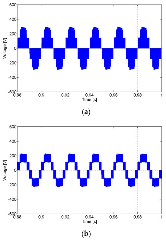 Simulation results of the load voltage for shoot-through of 0.08 and (a) standard modulation strategy or (b) newly proposed modulation strategy.