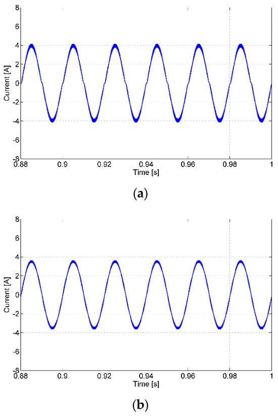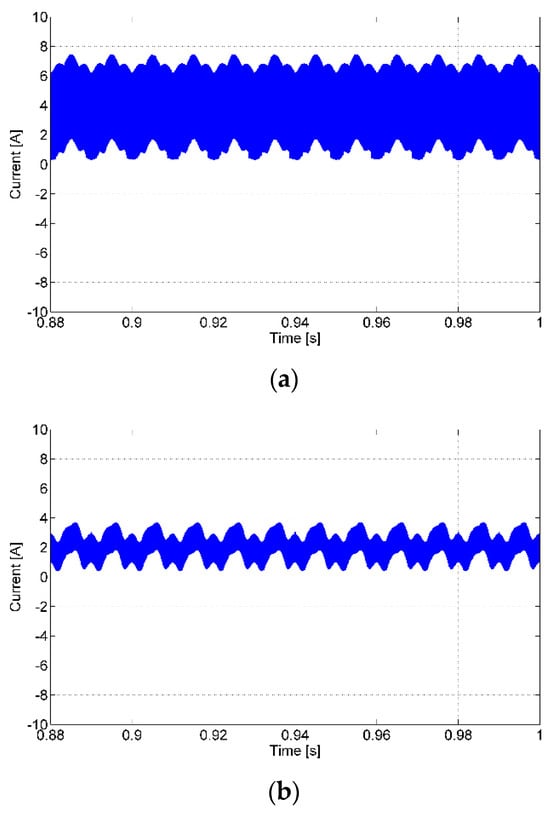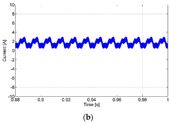 Simulation tests with an increased shoot-through value (but the same modulation index value of 0.8) for the standard and the newly proposed strategies were also performed. Figure 14, Figure 15 and Figure 16 show the results of the AC output voltage, AC output current, and converter input current, respectively, comparing the two modulation strategies when the shoot-through increases to 0.08. As expected, the load voltage and current amplitudes increase, but the overall behavior is quite similar to the previous simulation tests. Figure 14a shows the AC output load voltage of the existing modulation, defined as standard modulation, and Figure 14b presents the same voltage for the newly proposed modulation, considering the same modulation index value of 0.8 and the new shoot-through value of 0.08. Again, this result shows that the new modulation generates a lower THD voltage. Figure 15a shows the AC output current waveform of the standard modulation and Figure 15b shows the same current for the proposed new modulation, considering the same modulation index and the new shoot-through value of 0.08. One noticeable difference is that the amplitude of the load current obtained with the newly proposed modulation strategy is now roughly equal to that obtained with the existing modulation strategy and shoot-through 0.05. One encouraging finding, though, is that the load voltage peak value obtained using the newly proposed modulation strategy and the shoot-through of 0.08 (Figure 14b) is smaller than the load voltage obtained using the standard modulation strategy (Figure 11a) with a shoot-through of 0.05. Therefore, the proposed strategy requires a lower load peak value voltage to achieve the same output load current. Indeed, the voltage peak in Figure 14b is 265 V (or 530 V peak-to-peak) and the peak voltage in Figure 11a is 300 V (or 600 V peak-to-peak). Several investigation studies show that the reduced peak voltage (direct and reverse voltage) decreases the probability of power devices’ breakdown, decreases the losses, decreases the operation temperature, and increases the reliability of the power semiconductors []. The converter input current exhibits a similar behavior because the ripple is reduced with the newly proposed modulation strategy. In fact, Figure 16 shows that, with the newly proposed modulation, the input current ripple is smaller when compared with the classical modulation strategy. The current ripple value obtained with the classical approach is about 64% compared to 38% for the newly proposed modulation strategy. So, considering the increased shoot-through value, the difference in current ripples obtained between the classical and the proposed strategies also increases. So, it is possible to conclude that this difference is not constant, being lower for lower shoot-through duty cycles.