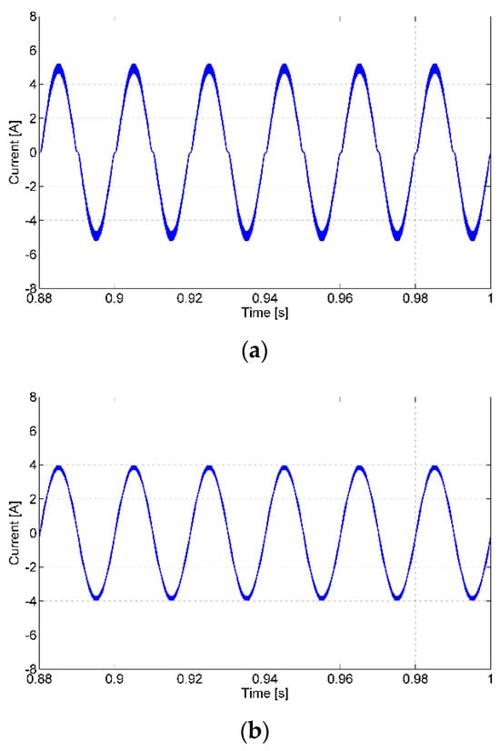 Simulation results of the load current for shoot-through of 0.05 and (a) standard modulation strategy or (b) newly proposed modulation strategy.