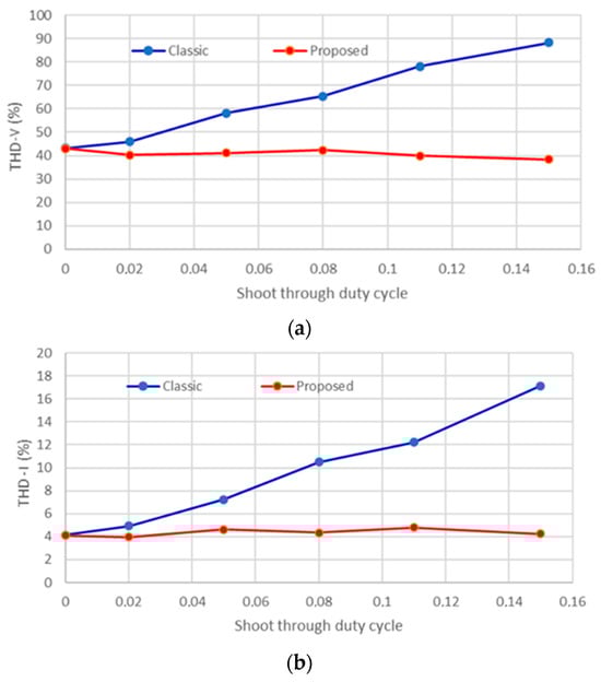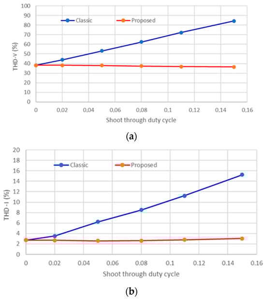 Simulation results of the THD as a function of the shoot-through duty cycle of the (a) load voltage (THD-V); (b) load current (THD-I).