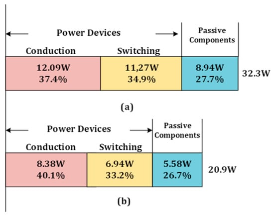 Power-loss breakdown at 200 V, 950 W and 5 kHz; (a)—classic modulation; (b) proposed modulation.