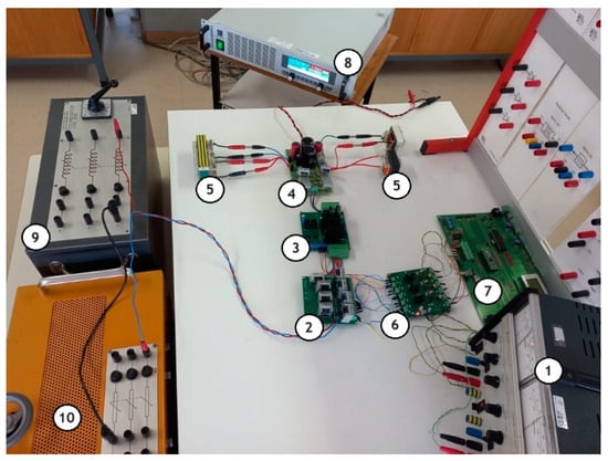 Experimental setup of the proposed system; (1)—the auxiliary power source; (2)—the single-phase full-bridge VSI; (3)—the bidirectional power devices of the proposed topology; (4)—the qZS circuit which includes two main electrolytic capacitors, two auxiliary capacitors, and two diodes; (5)—the four inductors used in the qZS circuit; (6)—the gate drive circuit board for power devices; (7)—the general purpose control board; (8)—main DC power source; (9)—load inductors; (10)—load resistors;.