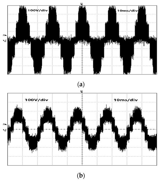 Experimental results of the load voltage for shoot-through of 0.08 and (a) existing modulation strategy or (b) newly proposed modulation strategy.