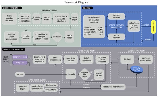 This diagram demonstrates the components and procedures of the proposed multi-agent framework for symbolic music generation. The “GHSOM Training” process explains how to create a hierarchical representation of music samples. To begin with, MIDI samples are pre-processed to obtain feature vectors, which are then prepared to train the growing hierarchical self-organizing maps (GHSOM). The obtained clusters are then visualized and analyzed for optimization. The reinforcement learning deep Q-network, “RL DQN”, which interacts with the user and the environment, represents the framework’s learning component. The “Generation Process” demonstrates the different steps and agent interactions involved in the music generation process. For more details, refer to Section 5 and Section 6.