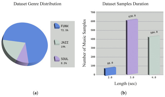 (a) The genre distribution of dataset samples. (b) The distribution of samples duration in seconds. The annotations on top of the bars indicate the corresponding number of samples for the specific value (bar).