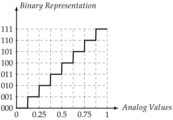 As depicted in Figure 2, for each analog value, a 3-bit digital value is assigned. After this process, the occurrence of each of n-bit codeword (for 3-bit cases ranging from 000 to 111), is determined. With this information, the frequency of the codewords is defined as function a . Using this information, the number of 1’s, i.e., , in the total activation data can be easily computed with the aid of Hamming weight function .