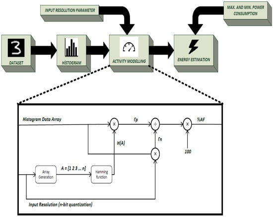 In Figure 3, a framework of our model is described. According to Figure 3, estimation starts by taking the histogram of the dataset. The histogram output of the dataset is an n-sized array where n denotes the bit width of quantization. A histogram array is applied to the input to generate as shown in the highlighted portion of the block diagram. Eventually, maximum and minimum power consumption of the IMC architecture are also determined. Our proposed analytical model uses exactly these three parameters to estimate energy.