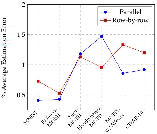 To evaluate the energy estimation accuracy of our analytical model, other MNIST-like datasets (Fashion-MNIST, Sign-MNIST, Handwritten-MNIST, and Noisy-MNIST) and the CIFAR-10 dataset are used when comparing the proposed analytical model against NeuroSim energy estimates. Furthermore, for each dataset, a double comparison is performed to investigate the accuracy of the analytical model for row-by-row and parallel MAC operations. The results of these evaluations and overall performances are summarized in Figure 6. Here, it can be seen that the average errors of the proposed analytical model do not exceed 1.5% for the whole group of datasets.