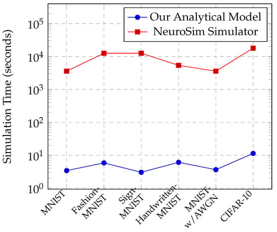 However, as the complexity of DNN structures increases, simulation times can reach hours or even days. Moreover, in the case of larger datasets, simulation runtimes will increase further. To speed up such analyses, semi-analytical models were also introduced in papers [30,31,32]. This approach is still based on simulations during which power consumption of a few key blocks is analytically computed and the simulation load is somewhat reduced. However, simulation times can still reach many hours.