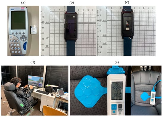The sensors used in the experiment and the situation during the DS. (a) Holter ECG with built-in 3-axis accelerometer and handy controller. (b,c) Wristwatch-type wearable (sensor Silmme22). (b) Display; (c) Sensor part. (d) Scenery during the experiment. (e) Measurement of seating pressure by Palm Q.