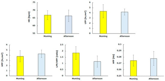 Mean and standard error of HRV indices during morning and afternoon DS driving. The figure shows the mean value and standard error.