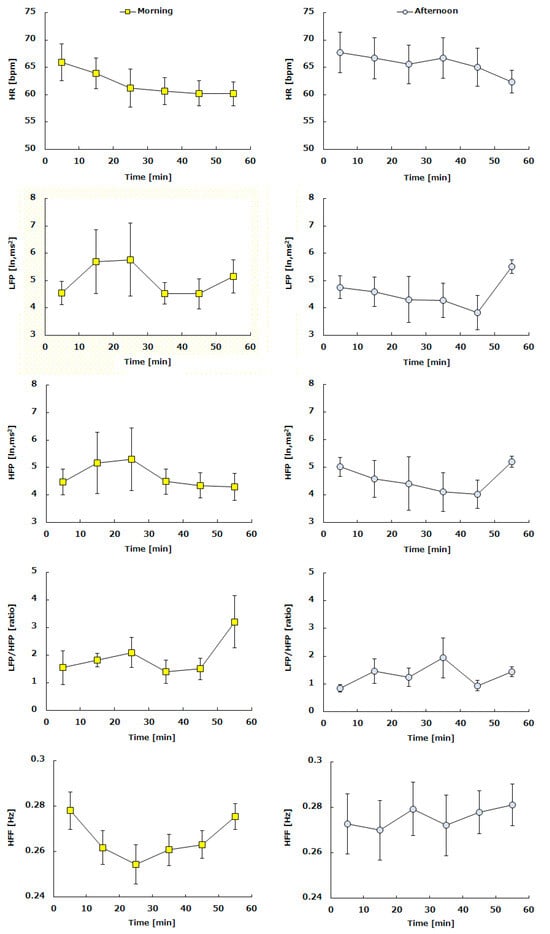 ECG was measured using the Holter ECG with a built-in 3-axis accelerometer (Cardy303 Pico, Suzuken, Japan, Figure 1a). It has dimensions of 28 mm (W) × 42 mm (D) × 9 mm (H), a weight of 13 g, and a recording time of 24 h and uses a button-type lithium battery. The sampling frequency is 125 Hz, the sampling frequency of the acceleration is 31.25 Hz, and the 3-axis acceleration of −4.5 to 4.5 G can be measured. From the ECG signal, all R waves (sharp deflections corresponding to the ventricular electrical excitation) were detected, and R-R interval time series were obtained. If there was an arrhythmia, the R-R interval was deleted and resampled at 2 Hz using the step function. Time domain indices and frequency domain indices of heart rate variability (HRV) were calculated from the R-R interval time series. The mean HR [bpm] was calculated as an index of the time domain. As indices in the frequency domain, LFP (power of low-frequency component; 0.04~0.15 Hz, [ln, ms2]), HFP (power of high-frequency component; 0.15~0.45 Hz, [ln, ms2]), LFP/HFP (LFP to HFP ratio), and HFF (peak frequency of the HF component, Hz) were calculated. Indices in the frequency domain were calculated by FFT (fast Fourier transform). LFP reflects both sympathetic and parasympathetic activity and baroreceptor reflex sensitivity, and HFP reflects para-sympathetic activity. LFP/HFP reflects sympathetic nerve activity, and HFF reflects respiratory frequency [,].