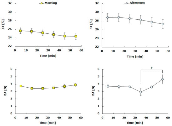 Changes in ST and BA over time during morning and afternoon DS driving. BA from 50 to 60 min was significantly increased compared with 30 to 40 min during afternoon DS driving. (* p = 0.036). Upper: ST, Lower: BA.