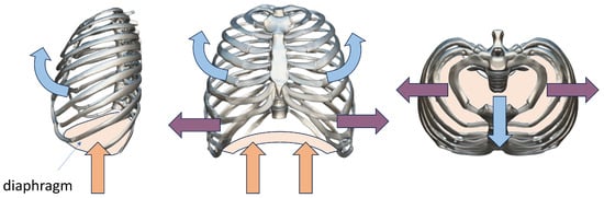 Measurements from the smartphone-embedded IMU sensors were validated first. Firstly, an acquisition procedure was defined to evaluate the feasibility. A sample of 10 healthy volunteer subjects (31 ± 1.5 and 30 ± 2.2 years old, BMI of 22.9 ± 4.0 and 19.5 ± 3.9, for 4 males and 6 females, respectively) were involved for the preliminary data recording protocol. Different smartphone positioning configurations were defined to fully explore respiratory kinematics at both the chest and abdomen levels. It is, in fact, established that the respiratory act generates complex kinematics at the rib cage level []. Figure 1 shows the summary of the movements of the rib cage and diaphragm during the respiratory cycle. As can be seen, the kinematics include multiple degrees of freedom in three-dimensional space, also considering the movement imposed by diaphragm compression [,].