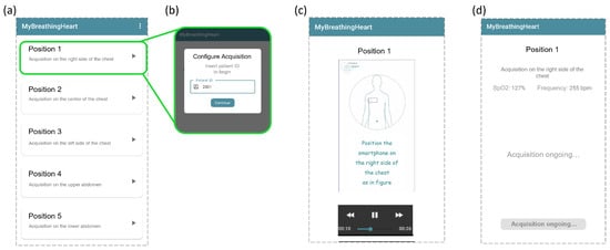 Application interface examples: position selection (a), user identification (b), positioning sample video reproduction (c), and acquisition interface (d).