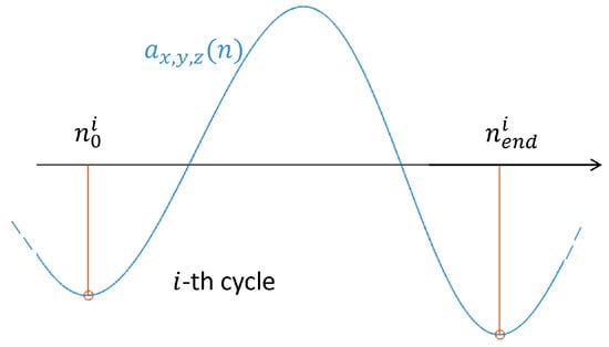 The smartphone at these minima was assumed to be stationary and, consequently, acceleration components were assumed to be zero. To follow this assumption, the acceleration signals at the i-th cycle () were processed according to a linear drift correction: